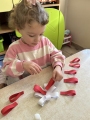 Dzieci z grupy „Motylki” zrealizowały kolejne zadanie w ramach Projektu Edukacyjnego pt. „Dotknij, poczuj, policz…kolorowa matematyka dla smyka”. Tego dnia maluchy przyszły do przedszkola ubrane na czarno. Aby lepiej utrwalić sobie nowy kolor przedszkolaki znów zamieniły się w poszukiwaczy. Próbowały znaleźć czarne lub częściowo czarne przedmioty ukryte w sali. Następnie maluchy doskonaliły umiejętność przeliczania przyklejając biedronkom odpowiednią ilość kropek. Tym razem zadanie sensoryczne polegało na wykonaniu czarnej ciastoliny z mąki, soli, oleju, proszku do pieczenia, wody oraz barwnika. Maluchy aktywnie uczestniczyły w procesie tworzenia masy, a następnie formowały z niej dowolne figury.