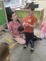 W poniedziałek grupę „Żabki” odwiedziła mama Kuby i Pawła, Pani Anna Cieślak. Przedszkolaki dowiedziały się co należy robić żeby prowadzić zdrowy styl życia. Dzieci klasyfikowały produkty spożywcze - począwszy od produktów najzdrowszych i najbardziej wartościowych po te, które w odżywianiu mogłyby być wyeliminowane. Pani Ania tłumaczyła dzieciom, dlaczego należy ograniczyć słodycze i słodkie napoje, a dlaczego należy zwiększyć spożywanie owoców i warzyw. Spotkanie zakończyło się podziękowaniem połączonym z pamiątkowymi zdjęciami.
